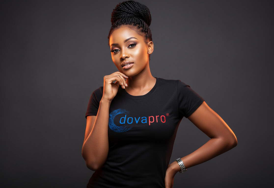 Render Irene Mbasha, a striking Tanzanian vixen, wearing a Dovapro T-shirt in a studio photoshoot. Lighting is dramatic, highlighting her eyes and bold expression. She poses with style, giving a mix of sophistication and youthful charm.